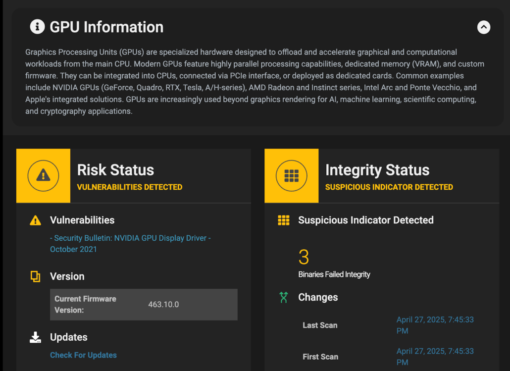 Proactively alert on changes in components and configurations. Scan and verify all production GPUs and connected infrastructure to assure known-good firmware and configurations. |