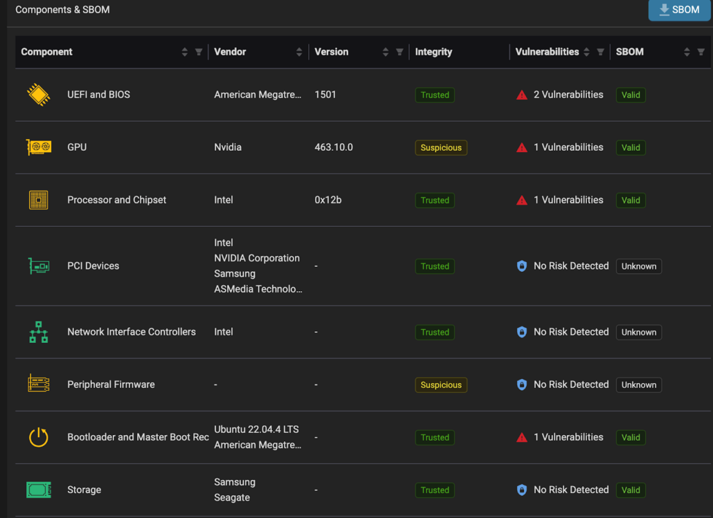 Eclypsium delivers complete inventory and vulnerability analysis of each component in a device, GPU, server, or connected network appliance. Identify vulnerabilities, outdated firmware, vulnerable GPU drivers, and other hardware and component level risks in AI data centers.