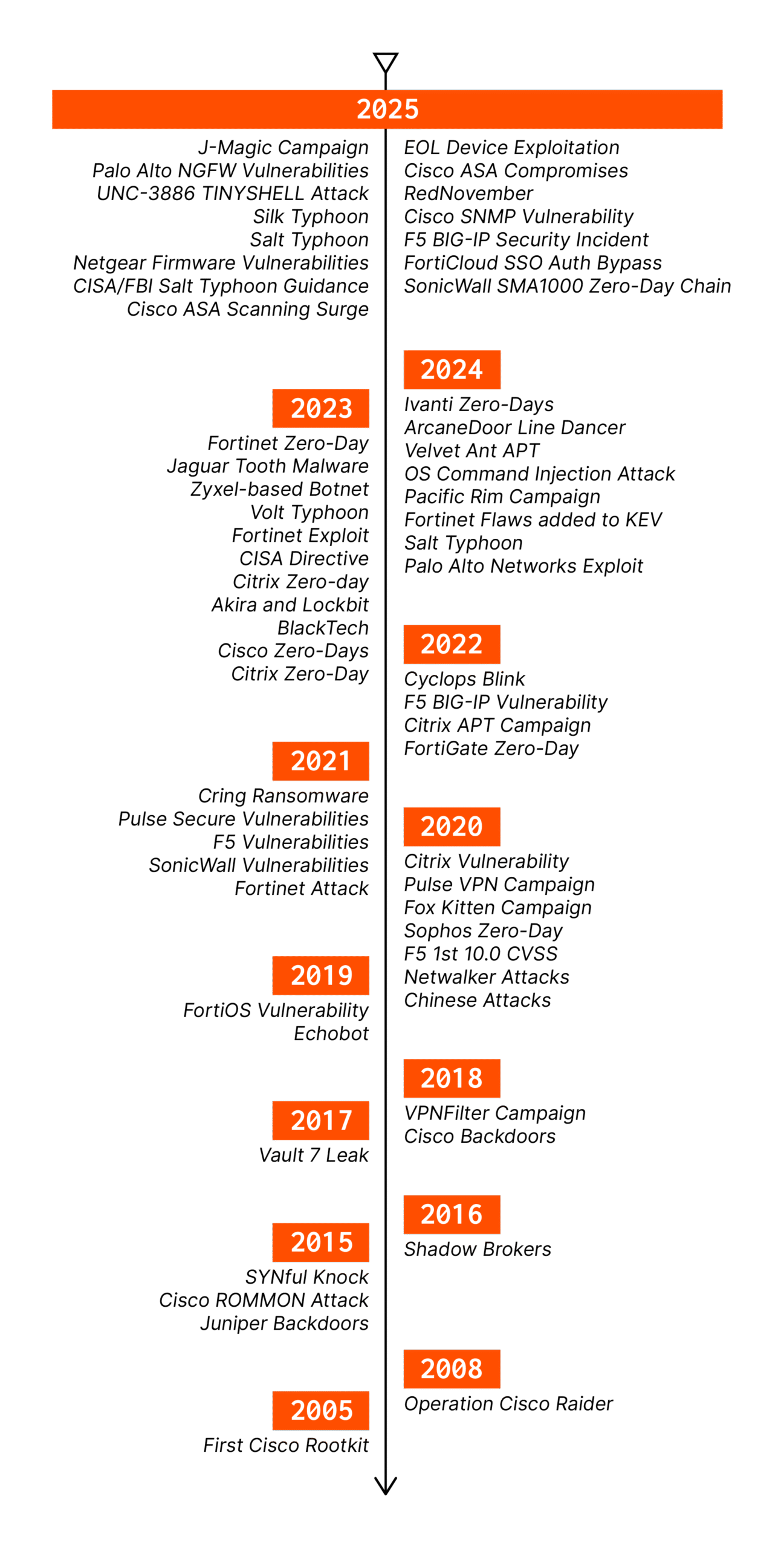 In 2025, the Verizon Data Breach Investigation Report (DBIR) reported an 8x increase in vulnerability exploitation against network edge devices such as VPNs, firewalls, load balancers, switches, and routers. They also reported a median time-to-exploitation of zero days for network vulnerabilities, and a median time to patch over 30 days. This prompted us to update our ongoing timeline of network device attacks, documenting the history of attacks against network devices since 2005. The 20 year trend of increasing attacks against the network edge shows no sign of slowing down. The infographic below is not exhaustive, but provides a visual depiction of how these attacks have grown in sophistication and scale.